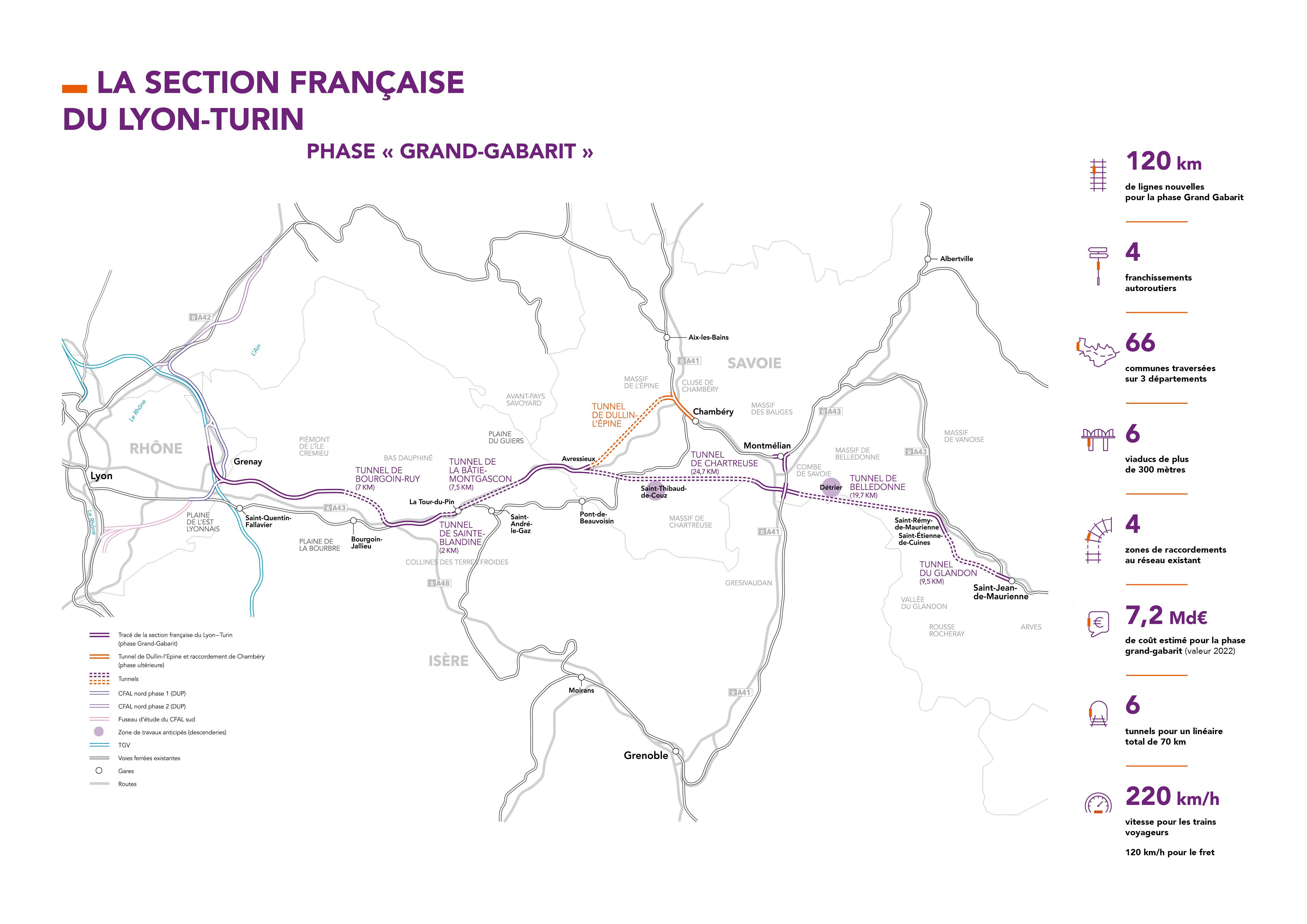 • Une première phase, dite "Grand Gabarit" qui consiste à réaliser concomitamment les phases 1 et 2 du projet (définies dans les documents de la déclaration d'utilité publique), à l’exception du tunnel de Dullin l’Epine et du raccordement de Chambéry. Cette première phase est constituée :*